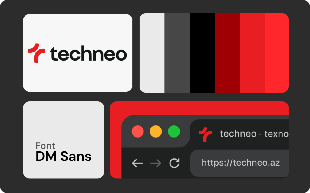 The Techneo brand is built around shades of red, black, and gray. The choice reflects its tech-oriented identity while creating a visual language familiar to local users.