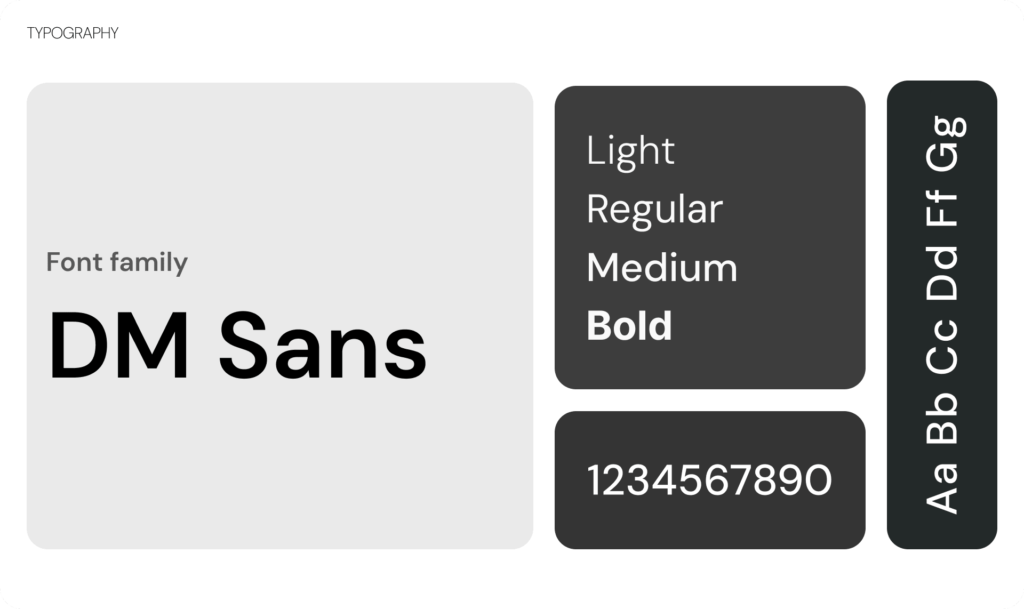 The main font chosen for the branding is DM Sans. With its modern and functional structure, it strengthens the brand’s tech-oriented identity. This highly readable sans-serif font works well across both web and mobile platforms.